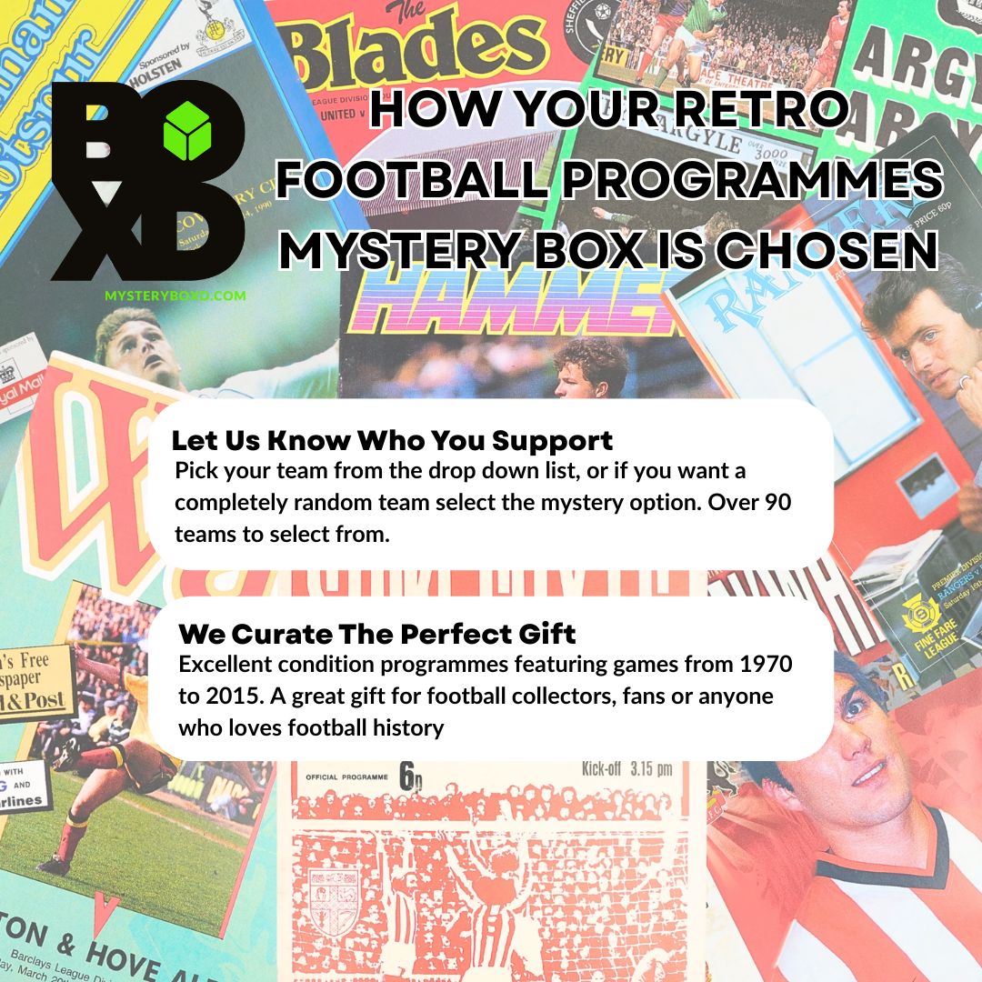 Each pack includes 2 authentic retro programmes (1970–2015) in excellent condition, carefully sourced and stocked across 92 clubs. -