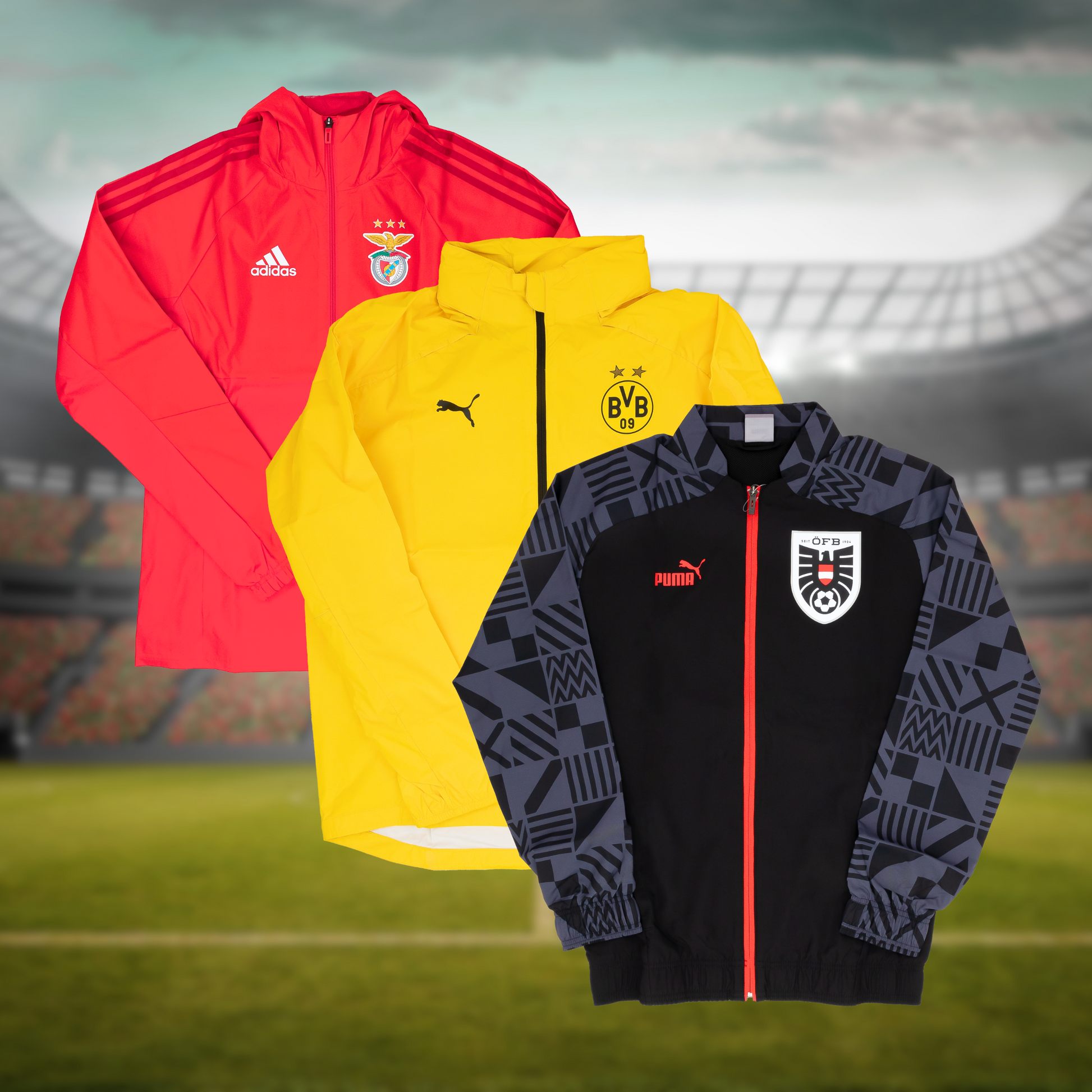 One brand new, 100% authentic football track jacket from a mystery club or national team. Your box may include a quarter zip, full zip or rain jacket—always official, always high quality.