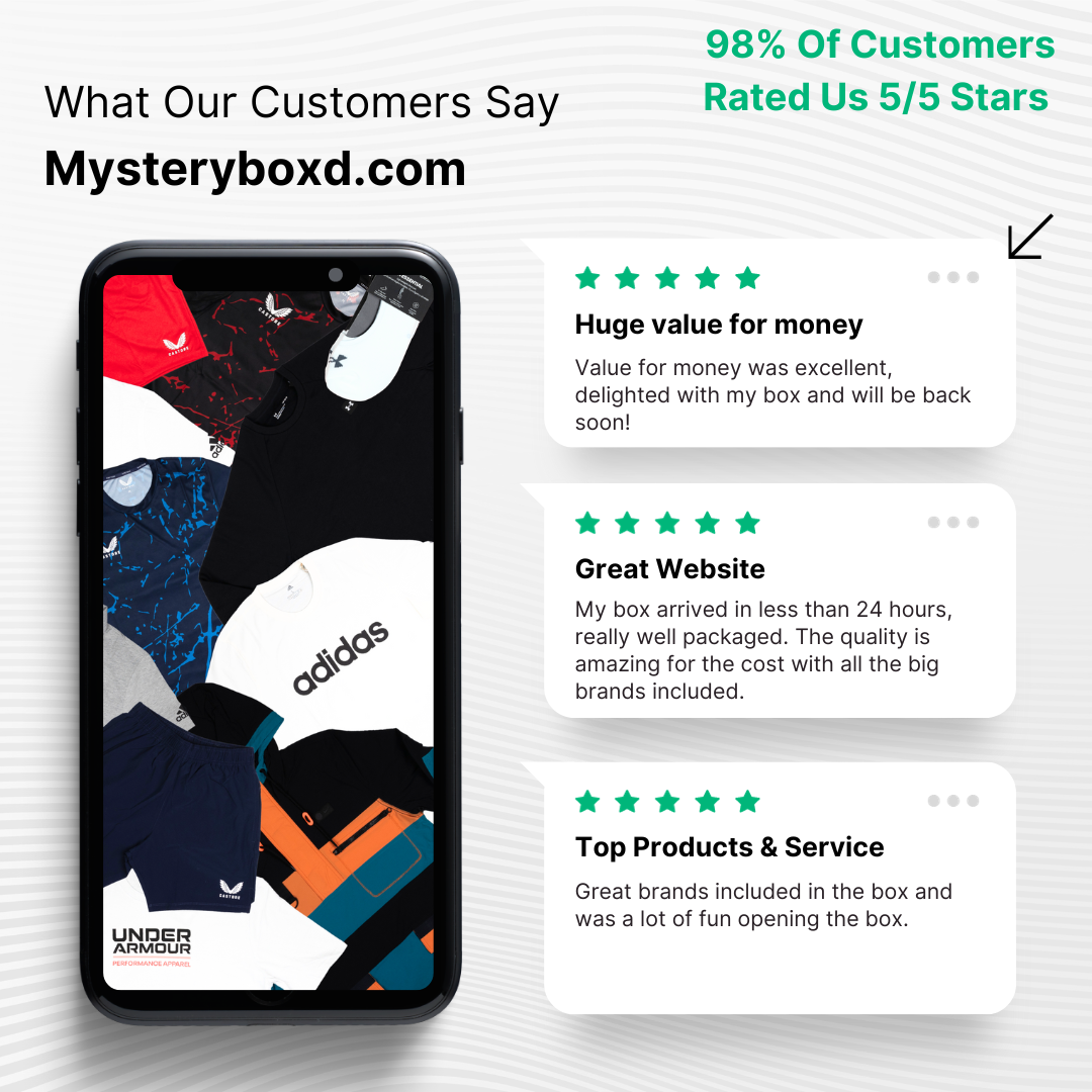 This box includes 2-3 mixed items from big brands such as Nike, Adidas, Under Armour and Castore with a minimum combined RRP of £95. You won't know what the contents are until you open the box - making it a thrilling surprise! Get ready for an exciting mystery and pick up your box today!